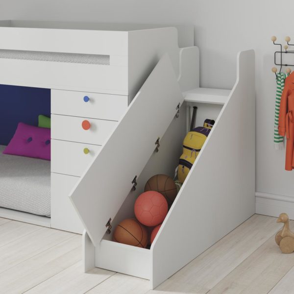Esta cama tren de lo más divertida seguro que hace las delicias de cualquier niño. Cama baja a modo de tatami, escalera de subida a la cama superior y …. tobogan de bajada que ademas es una puerta abatible como arcón de almacenaje.