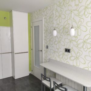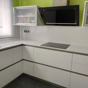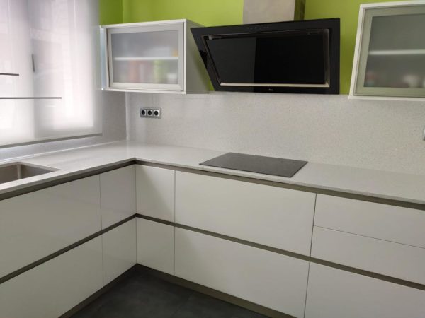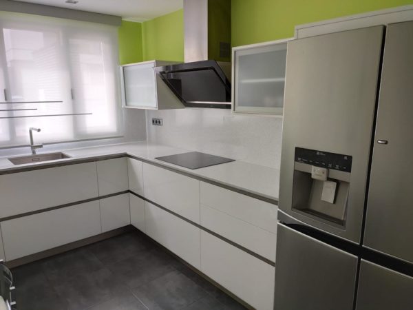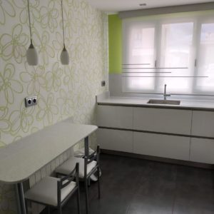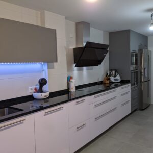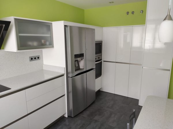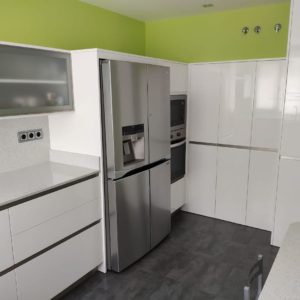 Esta cocina laca blanca tenia el reto de aprovechar la bajada de la escalera y para poder ver un frontal uniforme con el resto de la cocina se falseó la altura de las puertas, en esta zona bajo la escalera aprovechamos la zona central con un carro de grandes dimensiones con huecos y gavetas de almacenaje que pueden sacar a la cocina y acceder al resto, detras de la puerta se instalo la caldera y esta zona quedó aprovechada para escobas y cubos. Una cocina lacada brillo con uñero gola plana superior e intermedia. El cliente prescindió de azulejos y en su defecto se pinto en la zona de cocina y empapeló en la zona de barra. Todo el frontal de cocción u zona fregadero se aplacó del mismo silestone de la encimera. La elección de estos clientes para la distribución de la cocina así como la particularidad de empapelar en la zona de barra fué todo un acierto,pero  posiblemente el aprovechamiento de la subida de escalera sea lo mejor.