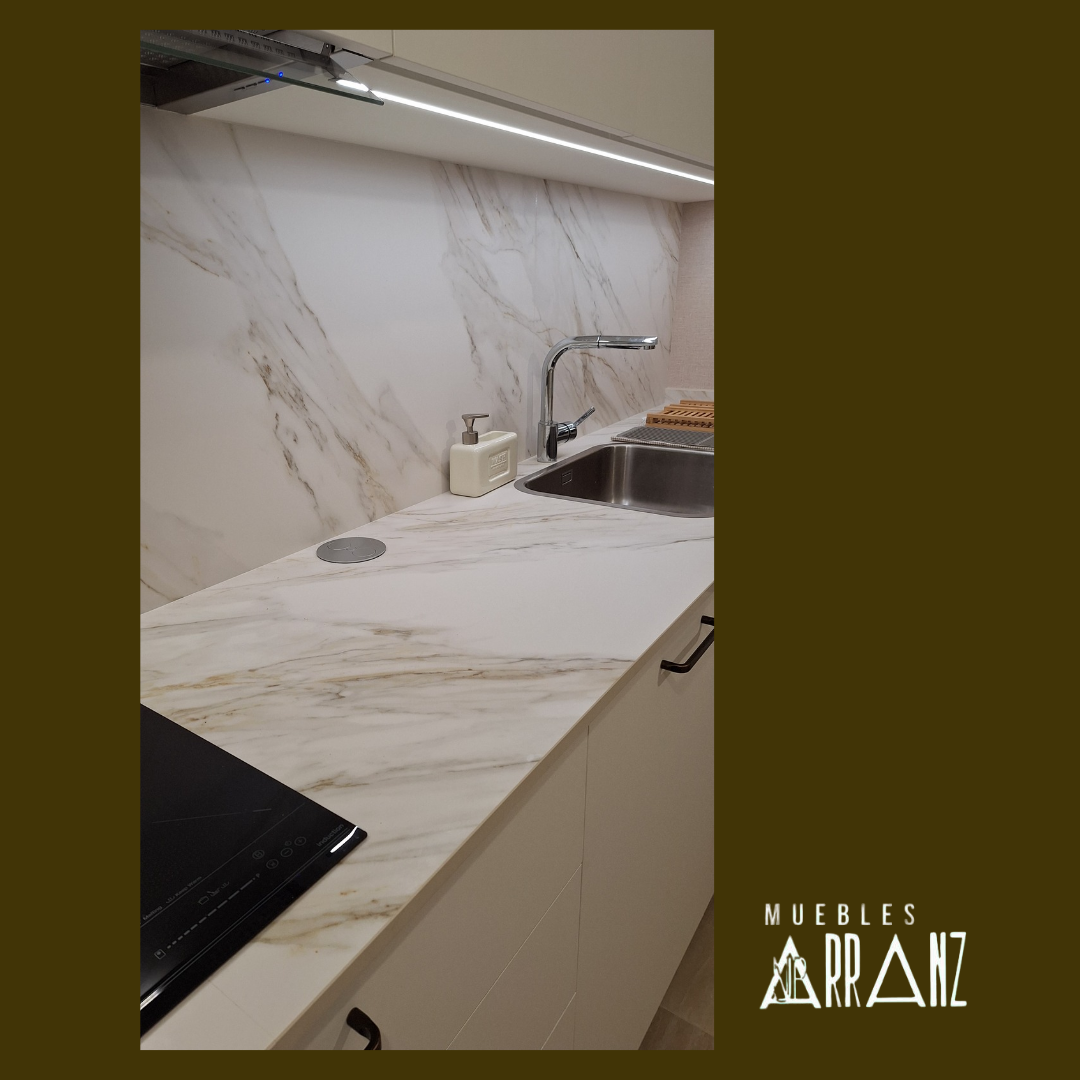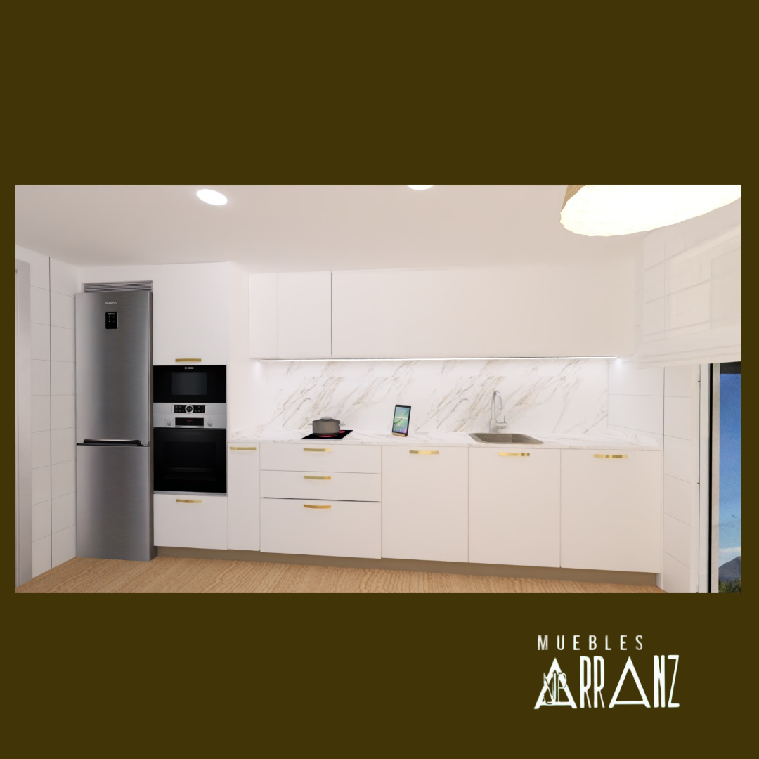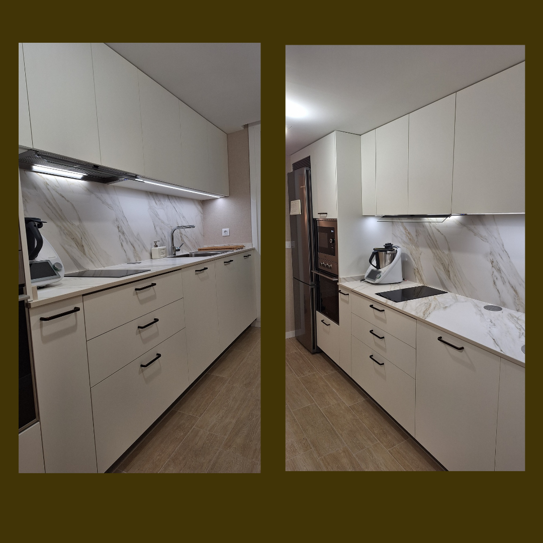 En este proyecto de cocina se toma como base la formica Traza blanco y se utiliza el acabado Teide Nuez y los tonos dorados de la encimera para hacer de esta cocina una estancia cálida. El papel tipo lino elegido por los clientes termina de dar un toque muy personal a esta bonita cocina.