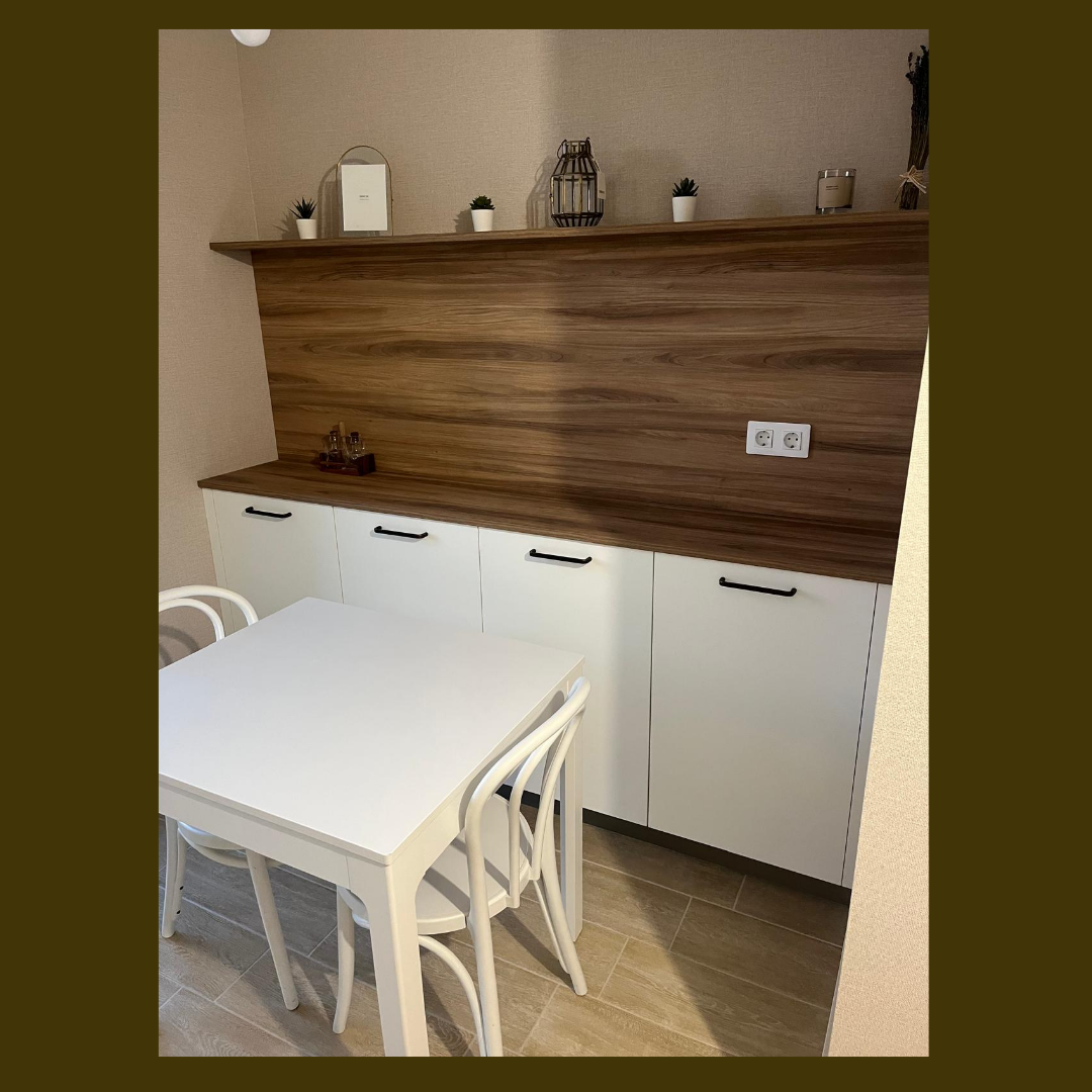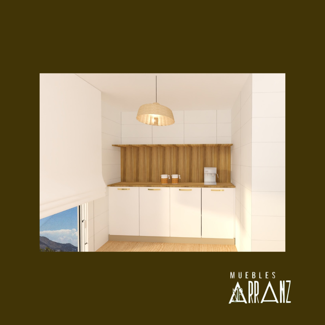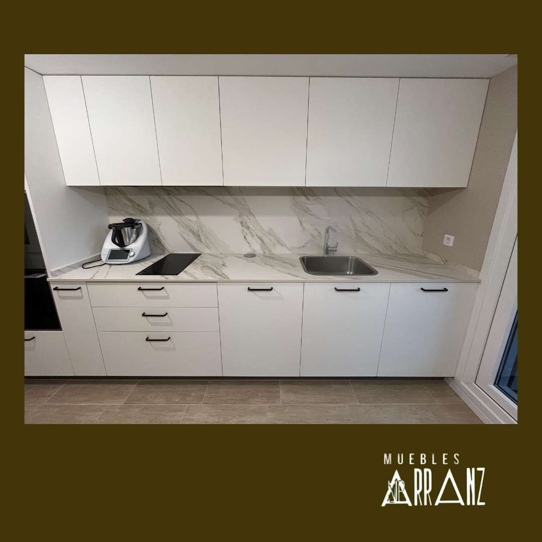 En este proyecto de cocina se toma como base la formica Traza blanco y se utiliza el acabado Teide Nuez y los tonos dorados de la encimera para hacer de esta cocina una estancia cálida. El papel tipo lino elegido por los clientes termina de dar un toque muy personal a esta bonita cocina.