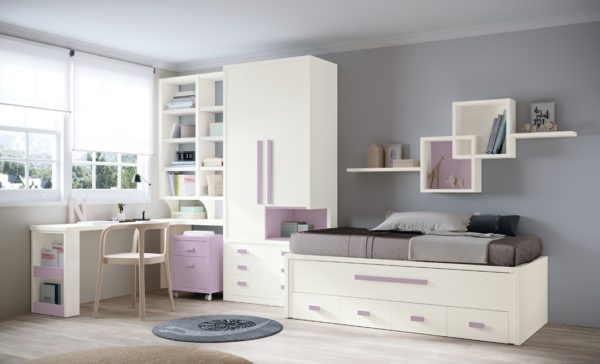 Este amplio programa de mueble juvenil fabricado laca tiene un excelente acabado y podemos amueblar una habitación juvenil como una infantil. Ademas de compactos como este de cama movil y cajones tambien fabrica camas, camas nido y camas horizontales y verticales.