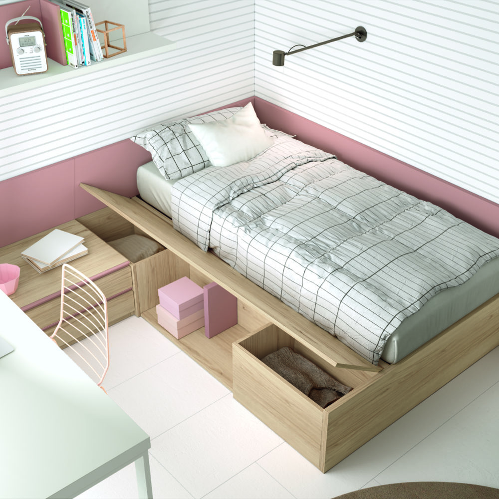 El aprovechamiento del espacio en una habitación juvenil es importante para dar espacio a ropa, juegos o juguetes, las camas abatibles nos permiten  dar solución a esto. Dar una continuidad con frisos y modulos de cajones hasta llegar a la mesa es la solución  de esa opción. Las posibilidades de colores y distintos módulos permiten infinidad de posibilidades con este programa.