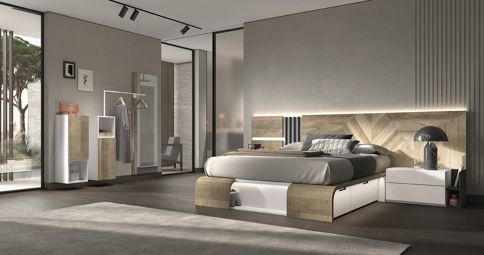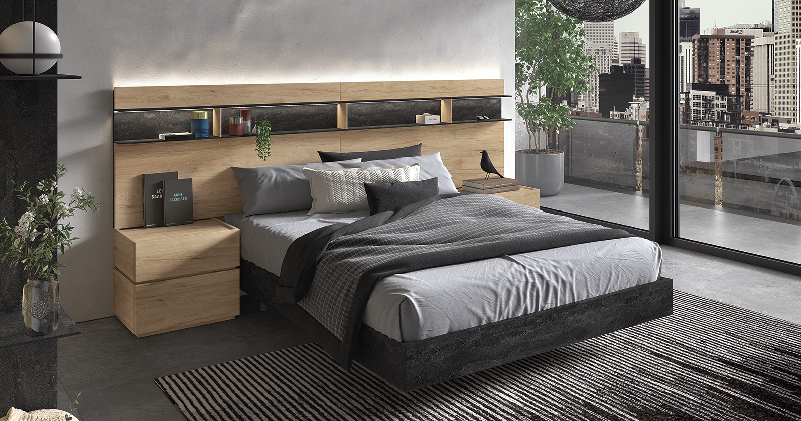 El programa de dormitorio Montes nos ofrece la posibilidad de elegir entre varios cabeceros y tipos de mesillas ademas de distintos acabados.