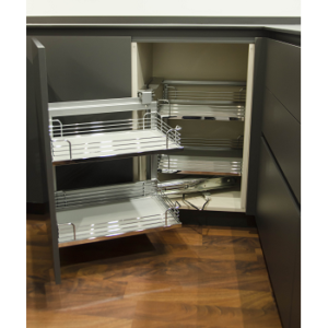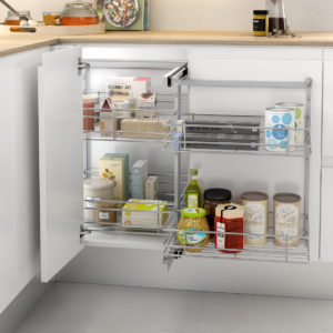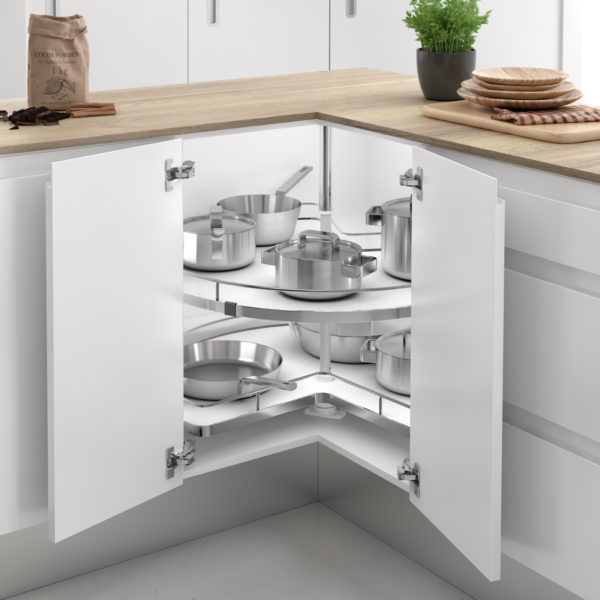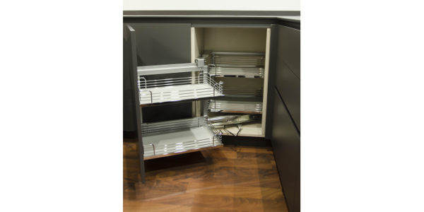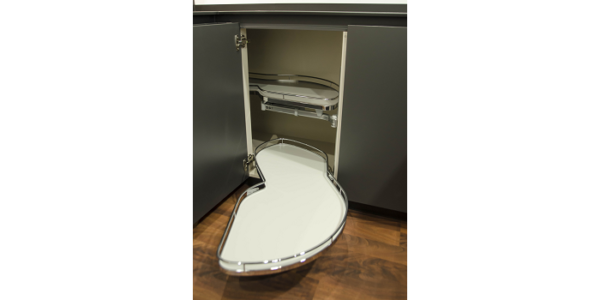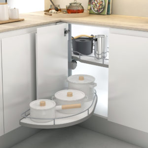 Los muebles de cocina en rincón angular son más aprovechables pero sobre todo más cómodos de uso si incorporamos mecanismo que mejoran su acceso como estos.