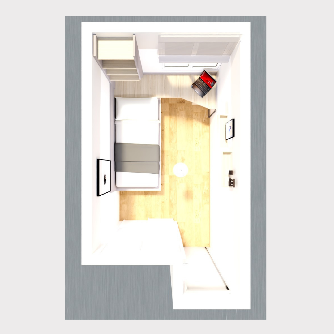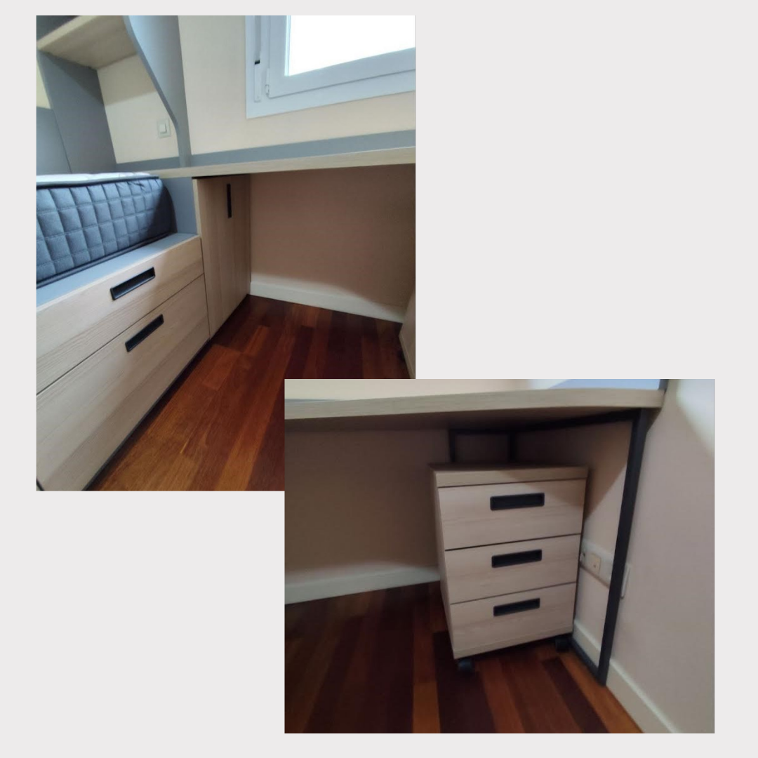 Mueble juvenil con acabados atemporales de los que no cansarse, madera clara y gris medio con un toque en tiradores embutidos de grafito.