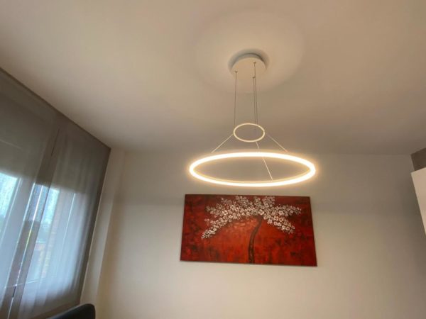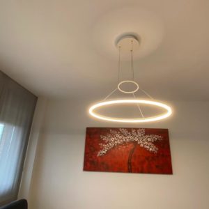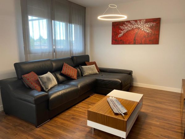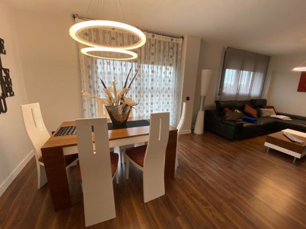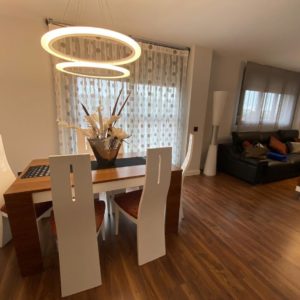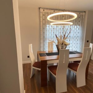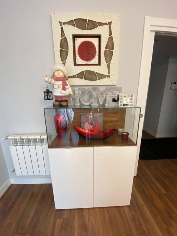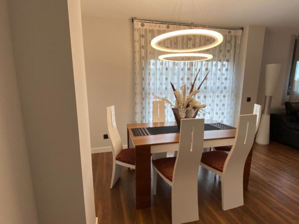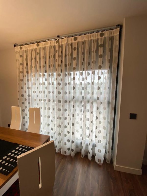 Bonito hasta el último detalle, nuestra personalidad se refleja en nuestra casa y en esta así es por el color y por mimo en los detalles. Un mueble de diseño en chapa natural de nogal americano y laca blanca, mezcla que se irá repitiendo por todo el salón. Para la tapiceria se opto por el rojo y el negro y motivos circulares que tambien se refleja en las lamparas led. Para las cortinas se combina cortina más práctica para la salida al exterior y estores lisos para la zona de sofas.
