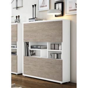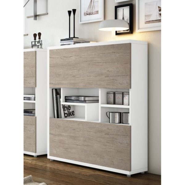 En un solo mueble podemos dar cabida a las pequeñas cosas que dejamos al entrar en casa y a su vez guardar zapatos en sus dos puertas abatibles. Este mueble se fabrica en en estratificados de colores lisos y tipo madera .